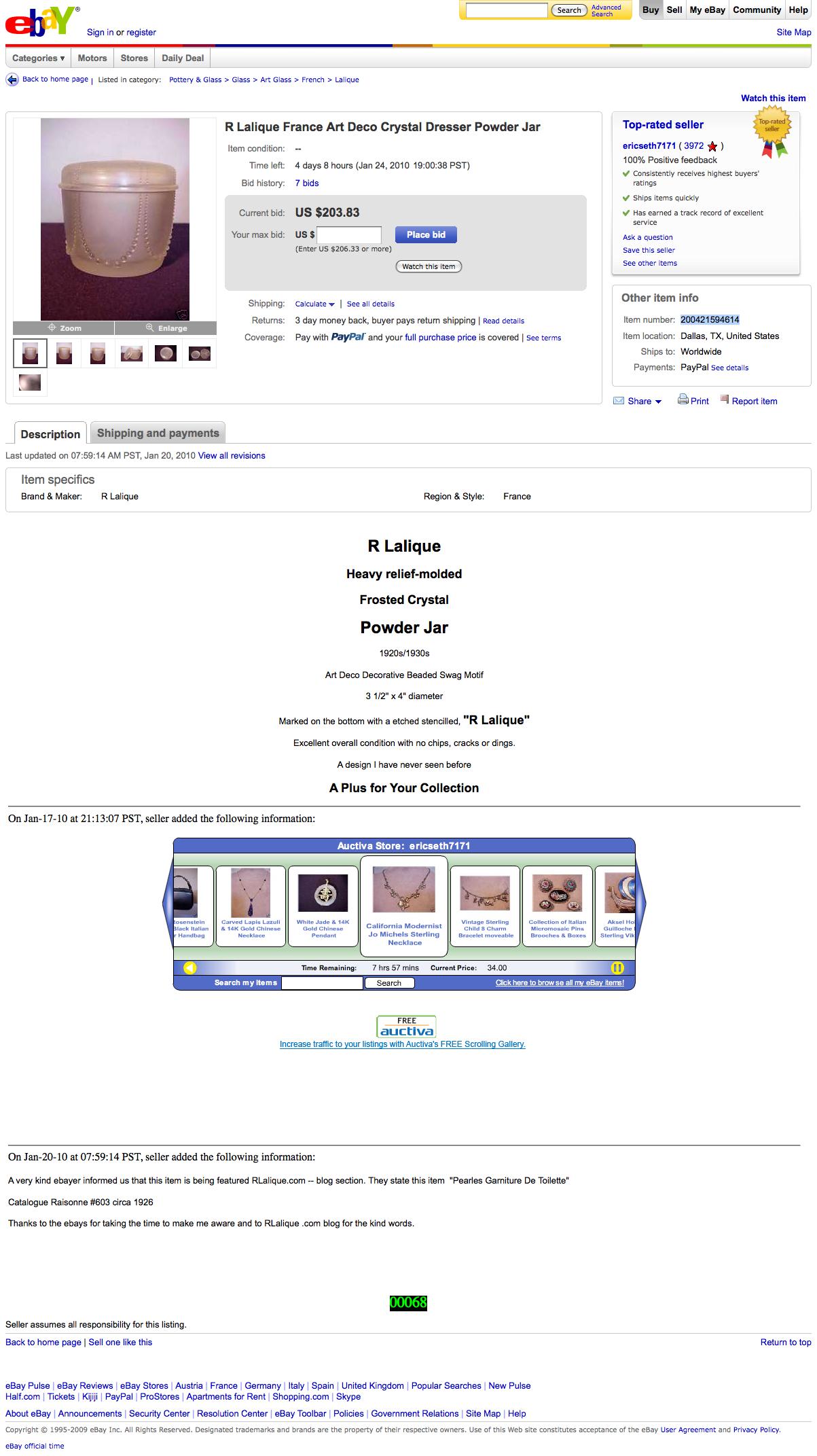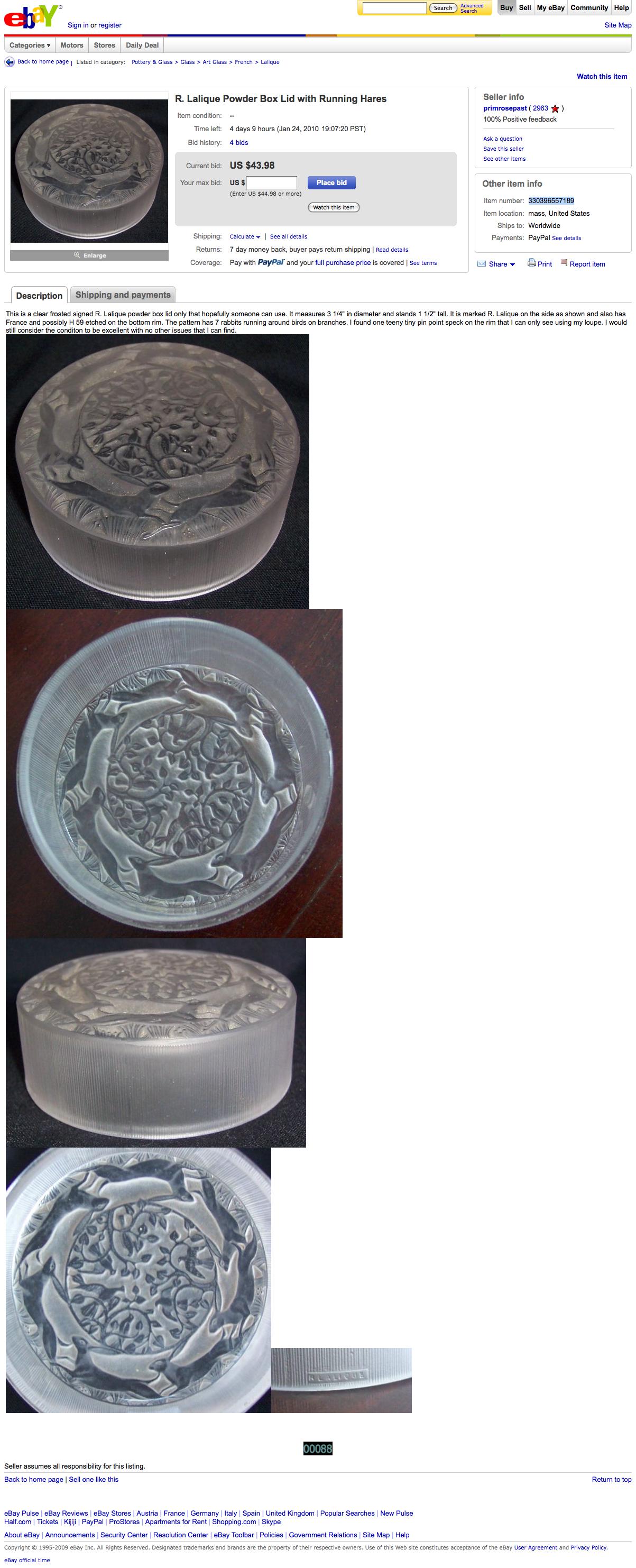 This great Lalique box started out at $9.99 with no reserve, and has worked it’s way up to around $200 as of this writing. Still not all the money by our thinking.
