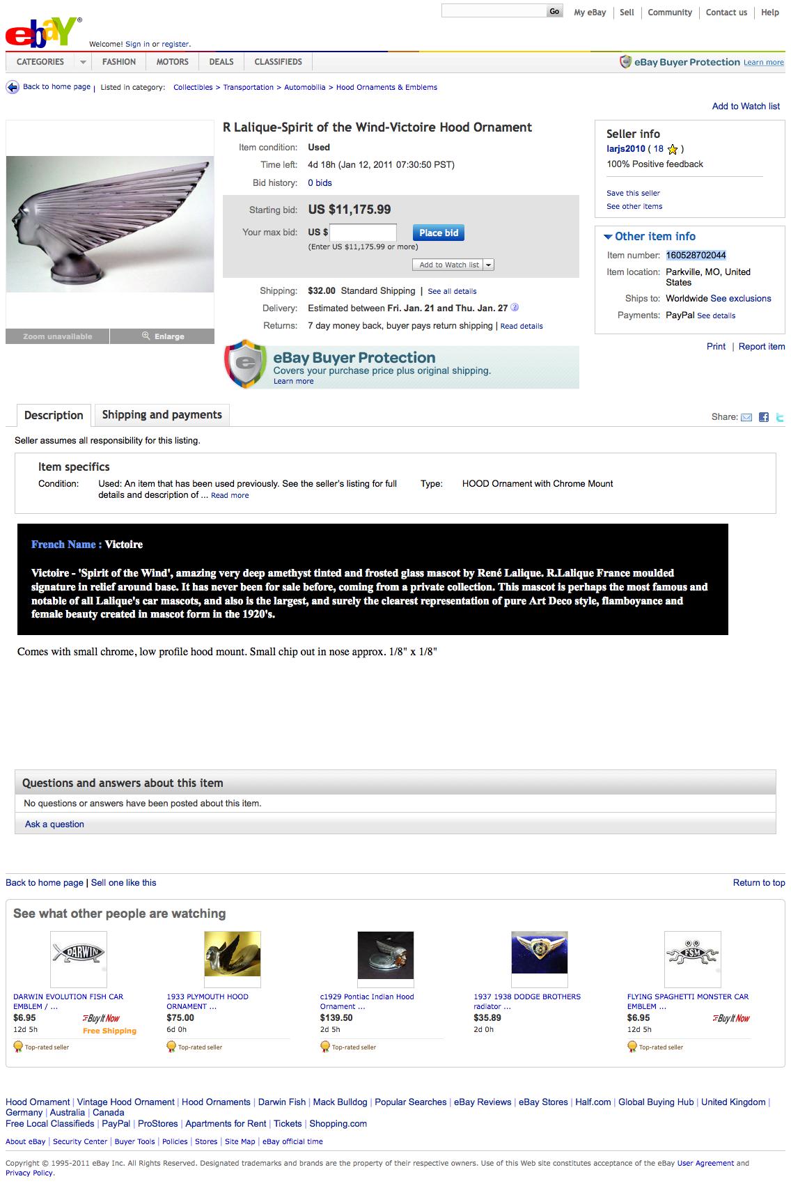 Rene Lalique Victoire Hood Ornament: The Stolen (Borrowed?) Lalique Photo Auction? Lalique Buyers Beware!